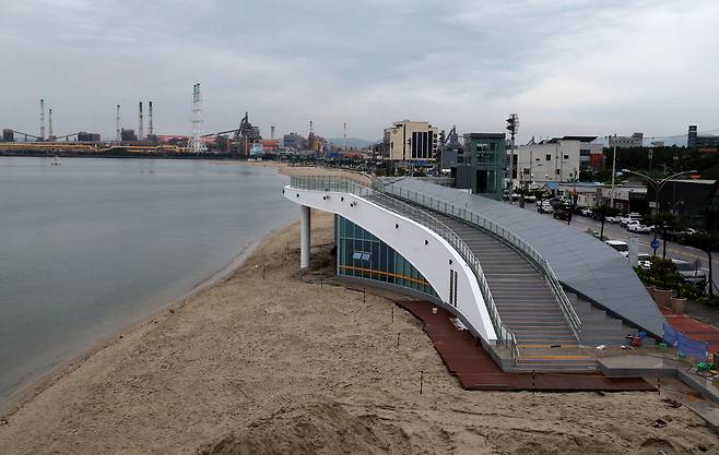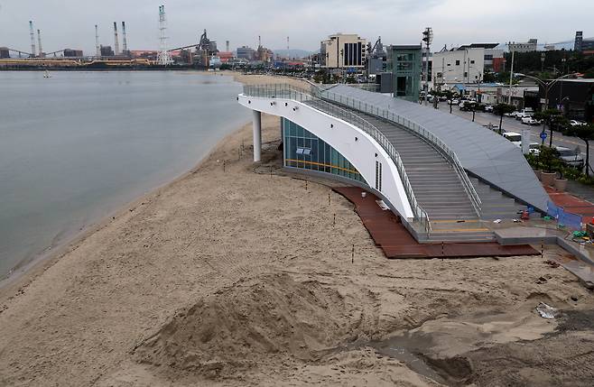 포항지역 8개 지정해수욕장이 다음 달 12일부터 정식 개장하는 가운데 2007년 이후 폐장한 송도해수욕장이 18년 만에 다시 문을 연다. 16일 오후 준공을 앞둔 송도해수욕장 바다 시청의 막바지 공사가 한창이다. /이용선기자 photokid@kbmaeil.com