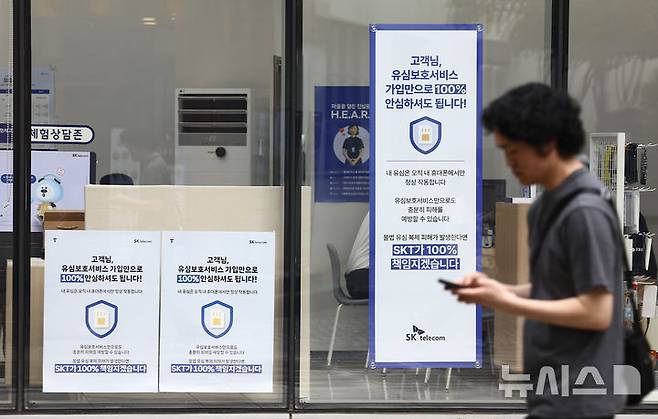 [서울=뉴시스] 김근수 기자 = 16일 서울 시내의 한 SK텔레콤 직영점 앞으로 시민이 지나가고 있다.