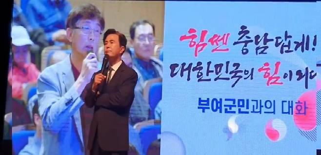 | ▲ 16일 충남 국립 부여 박물관 강당. 질문을 하고 있는 윤봉구 부여환경연대 사무국장과 질문을 듣고 있는 김태흠 충남지사. |