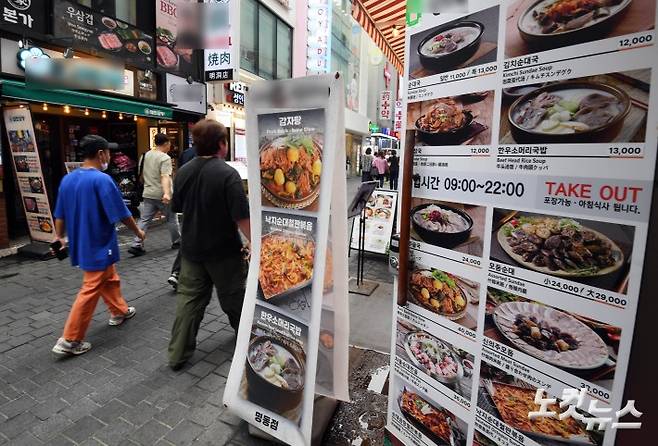 실질 구매력을 반영한 우리나라의 음식료품 물가가 경제협력개발기구 OECD 국가 가운데 두 번째로 높은 수준인 것으로 나타났다. OECD 물가수준 통계에 따르면 2023년 우리나라 식료품과 비주류 음료 가격 지수는 OECD 38개국 가운데 2번째로 높은 수치이다. 유럽의 대표적인 고물가 국가 스위스 163에 이어 147로 나타났고, 일본 126·독일 107·미국 94 등 주요 외국의 음식료품 음식료품 물가는 우리나라 보다 낮은 것으로 조사됐다. 사진은 16일 서울 명동거리에 음식점 안내판이 놓여 있다.