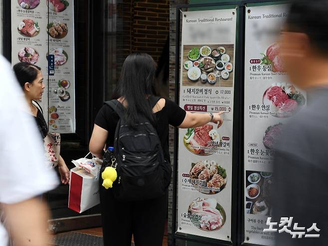 실질 구매력을 반영한 우리나라의 음식료품 물가가 경제협력개발기구 OECD 국가 가운데 두 번째로 높은 수준인 것으로 나타났다. OECD 물가수준 통계에 따르면 2023년 우리나라 식료품과 비주류 음료 가격 지수는 OECD 38개국 가운데 2번째로 높은 수치이다. 유럽의 대표적인 고물가 국가 스위스 163에 이어 147로 나타났고, 일본 126·독일 107·미국 94 등 주요 외국의 음식료품 음식료품 물가는 우리나라 보다 낮은 것으로 조사됐다. 사진은 16일 서울 명동거리에 음식점 안내판이 놓여 있다.