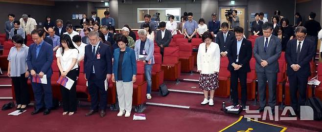 [서울=뉴시스] 조성봉 기자 = 송해진(왼쪽 세번째) 10.29 이태원참사 유가족협의회 운영위원장을 비롯한 참석자들이 16일 오후 서울 여의도 국회 의원회관 소회의실에서 열린 10.29 이태원참사 진상규명과 피해자 지원의 현황과 과제 토론회에 앞서 묵념을 하고 있다. 앞줄 왼쪽부터 용혜인 기본소득당 대표, 좌세준 10.29 이태원참사 피해구제심의위원장, 송 운영위원장, 송기춘 10.29 이태원참사 특별조사위원장, 남인순, 이수진, 박주민, 김남근 더불어민주당 의원, 윤복남 10.29 이태원참사 시민대책회의 공동대표. 2025.06.16. suncho21@newsis.com