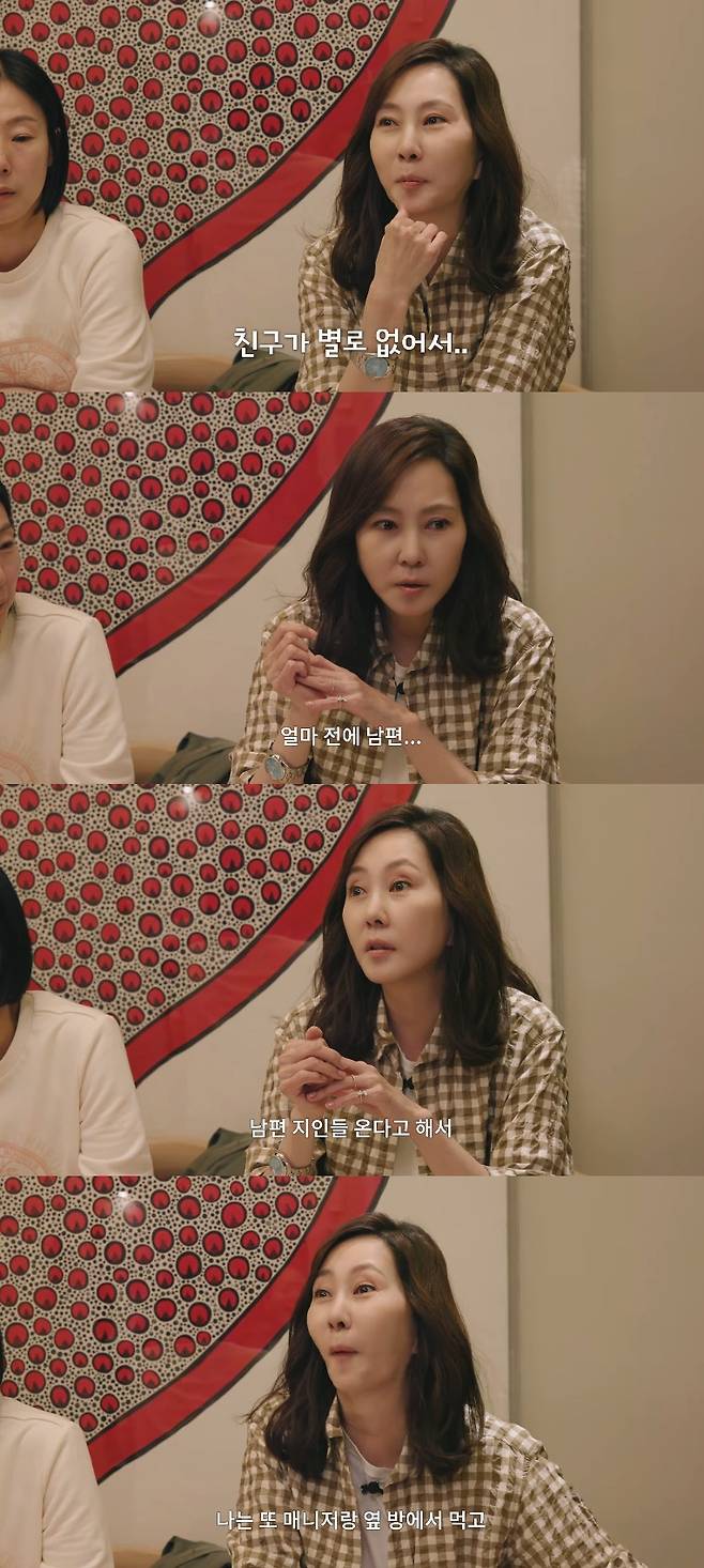 김남주는 "나는 사실 친구가 별로 없어서"라며 "얼마 전에 남편 지인들이랑 온다고 해서 저 사람(매니저)이랑 옆방에서 먹고"라고 지인과 자리를 가진 김승우의 옆방에서 매니저와 밥을 먹은 일화를 전하며 웃음을 터트렸다.
