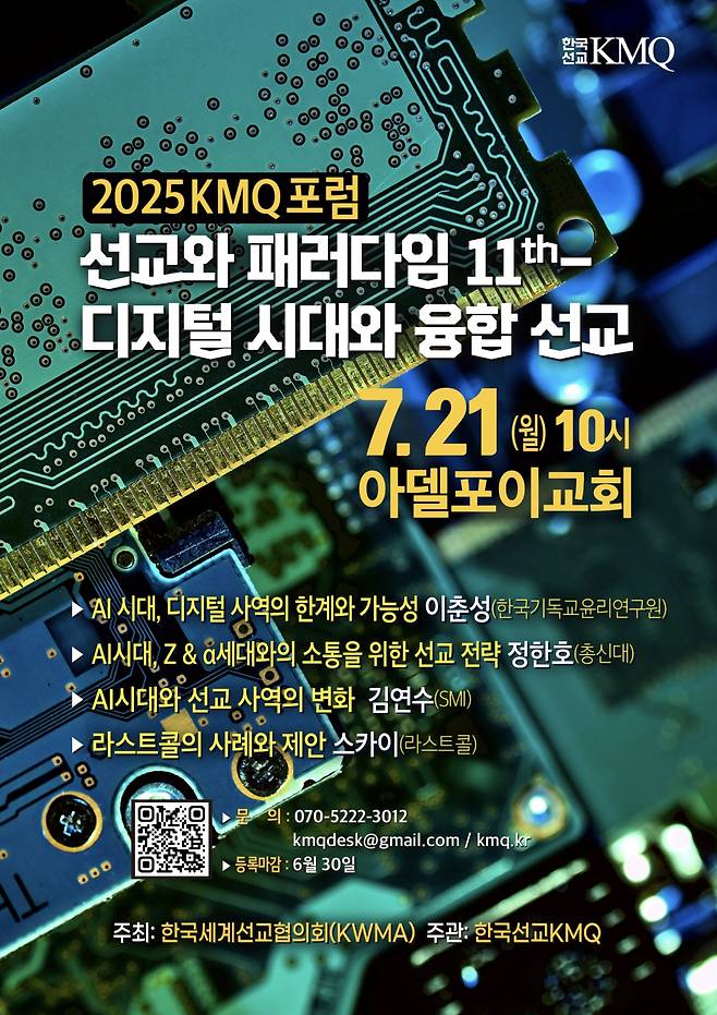 인공지능과 관련한 논의는 신학 분야 전반에서 활발하게 이어지고 있습니다. 한국세계선교협의회(KWMA·사무총장 강대흥 선교사)와 한국선교KMQ는 다음 달 21일 경기도 광명 아델포이교회(임동현 목사)에서 ‘디지털 시대와 융합 선교’를 주제로 포럼을 엽니다.