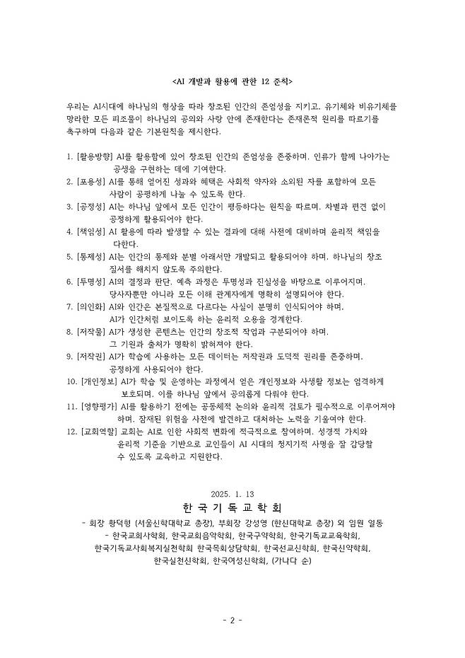 1974년 창립된 한국기독교학회는 전국 40여개 신학대·기독교대 소속 교수들이 모여 활동하는 국내 최대의 신학 학술단체입니다. 올해 초에는 AI 기술에 대한 방향성을 점검하며 12가지 윤리 준칙을 발표한 바 있습니다. 인간 존엄과 공동체성, 신학적 상상력의 회복을 중심으로 한 이 원칙은 기술 진보 속에서도 신학이 붙들어야 할 기준을 제시했습니다. 이날 학술대회도 같은 문제의식의 연장선에서 마련됐습니다.