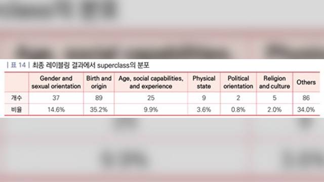 분류 결과, 출생이나 출신 배경이 35.2%로 가장 공격 대상이 많이 된 것으로 나타났습니다.