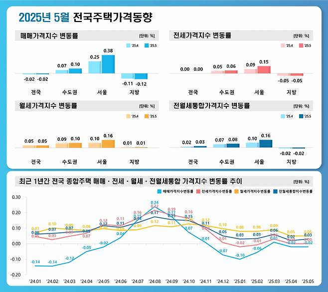 전국 주택 유형별 매매가격지수는 주택종합(-0.02%), 아파트(-0.03%), 연립주택(-0.03%) 모두 하락했고 단독주택은 0.08% 상승했다. 모든 유형이 상승한 서울은 아파트(0.54%), 주택종합(0.38%), 단독주택(0.22%), 연립주택(0.17%) 순으로 올랐다.