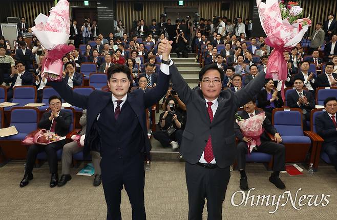 | ▲ 16일 서울 여의도 국회에서 열린 국민의힘 원내대표 선출 의원총회에서 새 원내대표로 당선된 송언석 의원이 김용태 비상대책위원장과 함께 두 팔 들어 인사하고 있다. |