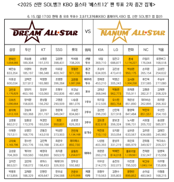 2024시즌에 이어 역대 두 번째 전반기 600만 관중 돌파를 앞둔 KBO리그의 열기는 올스타 팬 투표에서도 증명됐다. 2차 중간 집계 결과 총 투표수 257만 7376표로, 2024 올스타전 2차 중간 집계 때의 234만 1719표보다 약 10% 증가한 것. 올스타전에 출전할 베스트12를 뽑는 팬 투표는 오는 22일 오후 2시까지 진행되며, 팬 투표(70%)와 선수단 투표(30%) 결과를 합산한 최종 베스트12 명단은 23일 발표할 예정이다. 올해 올스타전은 한화의 홈구장이자 신축 구장인 대전 한화생명볼파크에서 다음 달 12일 열린다.