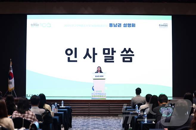 (서울=뉴스1) = 공미숙 통계청 사회통계국장이 16일 경남 거제시 소노캄 거제에서 열린 ‘2025 인구주택총조사 및 농림어업총조사’ 동남권 설명회에서 총조사 종합시행계획에 대해 설명하고 있다. (통계청 제공. 재판매 및 DB 금지) 2025.6.16/뉴스1