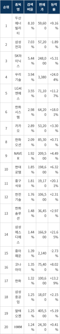 이밖에도 삼성에스디에스(018260) ▲21.65%, 흥구석유(024060) ▲20.11%, 한화(000880) ▲13.29%, 흥아해운(003280) ▼-2.73%, 코나아이(052400) ▲8.02%, 삼성중공업(010140) ▲2.15%, 한화솔루션(009830) ▲2.97%, 한전기술(052690) ▲2.31%, 알테오젠(196170) ▲5.19%, HMM(011200) ▲0.41% 등이 많이 검색되고 있다.
