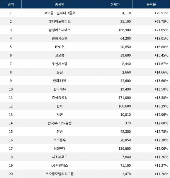 6위 코오롱(002020)은 종가 39,600원으로 15.45% 상승 마감했다. 7위 우신시스템(017370)은 종가 8,440원으로 14.67% 상승 마감했다. 8위 웅진(016880)은 종가 2,660원으로 14.66% 상승 마감했다. 9위 한화3우B(00088K)는 종가 42,600원으로 13.60% 상승 마감했다. 10위 한국석유(004090)는 종가 19,490원으로 13.58% 상승 마감했다.