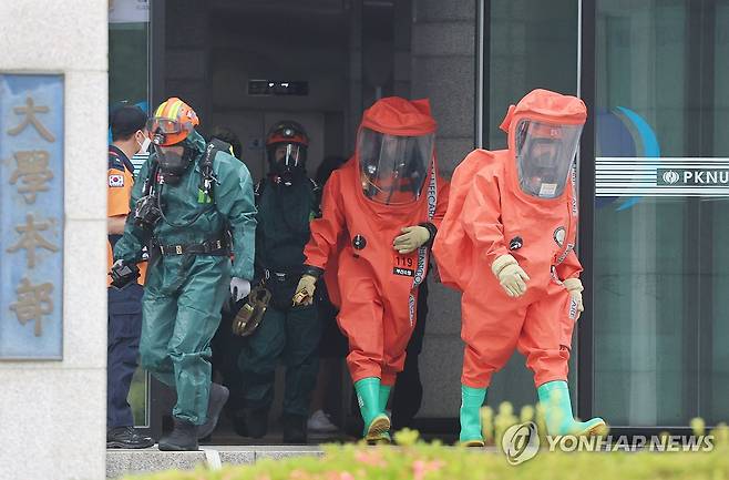 이날 훈련은 대학본부 지하실에서 화재와 폭발, 가스 누출로 인해 대형 화재가 발생한 상황을 가정해 국립부경대, 남부소방서, 경찰과 남구청, 긴급구조지원기관 등 10여개 단체에서 170여 명이 참여했다. 2025.6.16