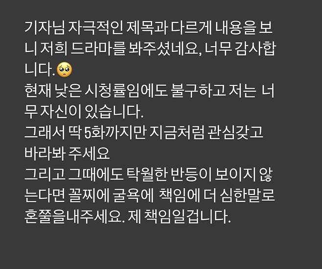 "현재 낮은 시청률임에도 불구하고 저는 너무 자신 있습니다. 딱 5회까지만 지금처럼 관심 갖고 바라봐 주세요."