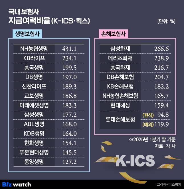 올 1분기 말 기준 국내 보험사 킥스 비율을 기준으로 보면 삼성생명(177.2%)과 교보생명(186.8%), 미래에셋생명(183.3%)과 신한라이프(189.3%), KB손해보험(182.2%) 등이 연말까지 현 수준을 유지한다면 해약환급금준비금 부담을 덜 수 있을 것으로 예상된다.