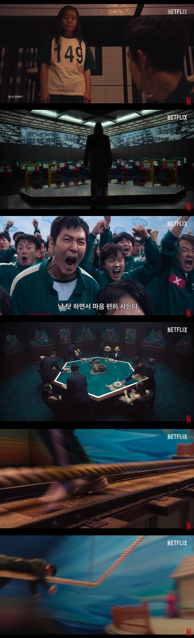 이어 영희가 휘두르는 줄넘기 줄에 날아가는 참가자, 오열하는 금자, 게임 중 싸우는 현주(박성훈), 눈물 흘리는 준희(조유리) 등의 모습이 짧게 나오며 궁금증을 자극한다.