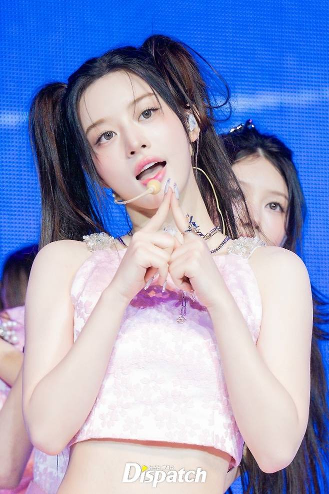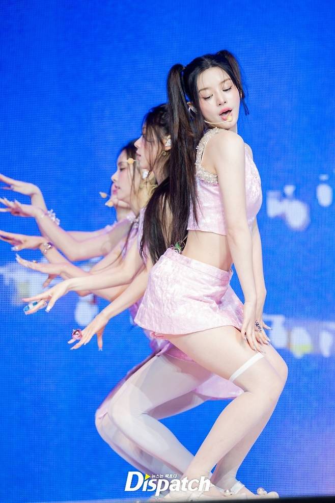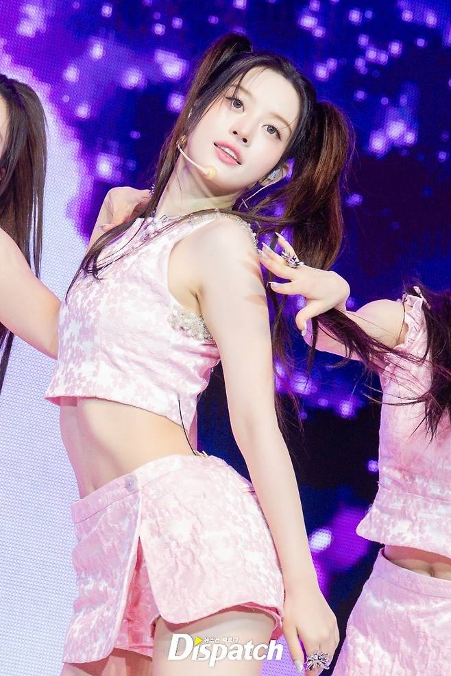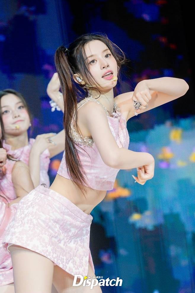 아일릿은 핑크 의상으로 마법소녀 스타일을 연출했다. 민주는 크롭탑으로 탄탄한 복근을 뽐냈다.