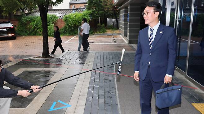 ▲ 김민석 국무총리 후보자가 16일 서울 종로구 통의동 금융감독연수원에 마련된 청문회 준비단 사무실로 출근하며 취재진 질문에 발언하고 있다.