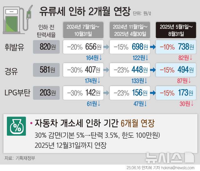 [서울=뉴시스] 정부가 중동 위기에 따른 국제유가 상승에 따라 유류세 인하 적용을 연장한다. 경유·수소천연가스(CNG) 유가연동보조금 지급도 6월말에서 8월말로 2개월 연장한다. 자동차 소비 회복 지원 등을 위해 6월30일 종료 예정인 승용차 개별소비세 한시적 인하 조치도 12월31일까지 6개월 추가 연장한다. (그래픽=안지혜 기자)
