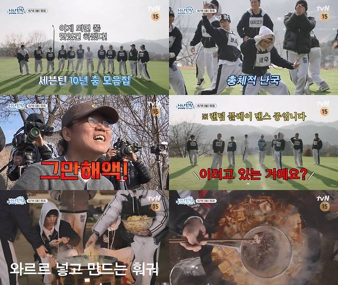 사골곰탕으로 든든히 배를 채운 멤버들은 세븐틴의 역대 히트곡을 총망라한 ‘랜덤 플레이 댄스’로 열기를 이어간다. “안무와 동선이 너무 헷갈린다”는 우려 속 음식 재료가 적힌 이름표가 등장하며 은근한 긴장감이 맴돈다고. 개인의 기억력(?)에 따라 저녁 식사의 양과 질이 좌지우지되는 만큼 부담이 더해진 상황에 모두가 필사적으로 게임에 몰입한다. 하지만 세븐틴은 이내 허둥지둥하며 총체적 난국에 빠지고, 급기야 나 PD는 “하지마! 그만해!”라고 외쳐 궁금증을 끌어올린다.