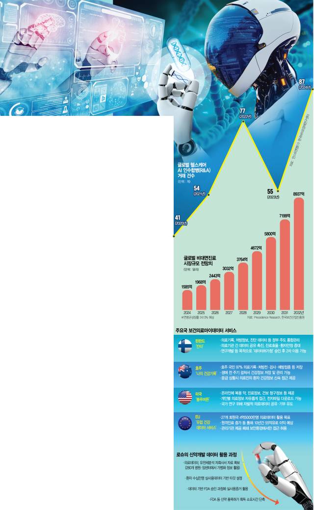 우리나라의 바이오 산업이 의료 데이터 규제로 제자리걸음을 면하지 못하는 동안 주요 해외 국가들은 빠르게 앞서가고 있다. 최근에는 신약 개발에 인공지능(AI)이 결합하면서 방대한 보건의료 데이터가 필요한 글로벌 빅파마(대형 제약사)들은 최대 시장인 미국을 중심으로 공격적으로 데이터를 확보하고 있다. 핀란드와 호주 등은 개인별 진료·건강 정보 등을 통합된 시스템에서 관리하는 ‘보건의료 마이데이터’를 통해 새로운 트렌드에 올라타고 있다. 코로나19 이후 대중화된 비대면 진료 역시 만성질환·정신건강 등 비교적 예측 가능하고 관리가 쉬운 질병을 중심으로 진료 체계를 확대하고 있다.