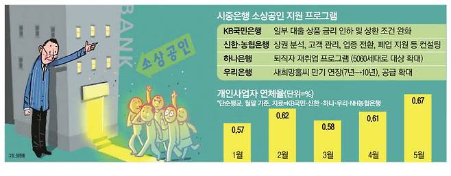 은행들이 소상공인 지원에 적극 나서는 것은 최근 개인사업자 대출 연체율이 빠르게 악화하고 있기 때문이다. 금융권에 따르면 5대 은행의 올해 5월 말 기준 개인사업자 대출 연체율은 0.67%로 한 달 만에 0.06%포인트 올랐고, 지난해 말(0.48%)보다는 0.19%포인트 뛰었다.