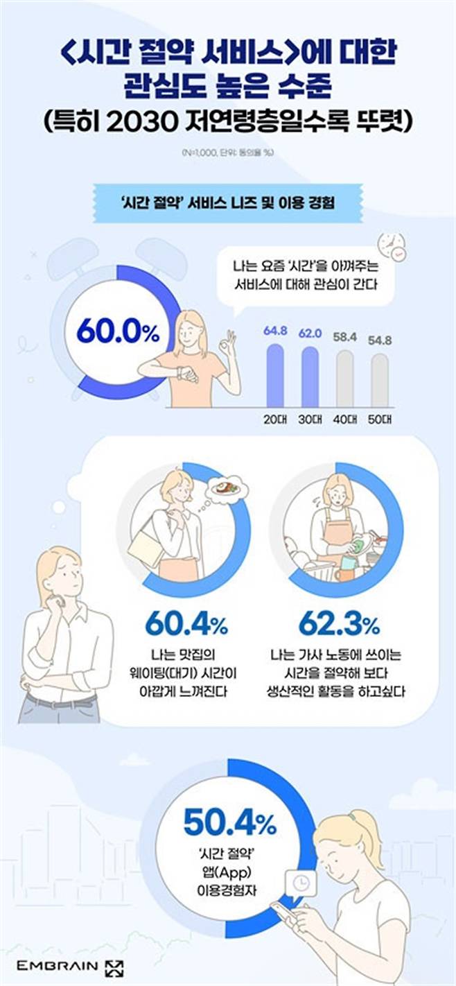 20대 사이에서 집안일을 업체에 맡기는 '집안일 외주화' 현상이 생긴 이유는 무엇일까. 엠브레인 트렌드모니터가 2023년 조사한 <시간 절약 서비스에 대한 관심도 수준>을 살펴보면, '나는 요즘 '시간'을 아껴주는 서비스에 대해 관심이 간다'고 답한 비율이 20대에서 64.8%로 가장 높게 나왔다.