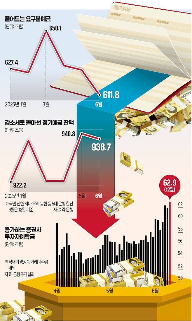 은행권 대기자금으로 꼽히는 요구불예금의 감소세는 더욱 심화하고 있다. 이달 들어서만 국내 5대 은행의 요구불예금 잔액(611조8826억원)이 14조8663억원 급감했다. 7영업일 만에 감소한 금액임을 고려하면 이달 전체 감소 폭은 20조원 이상일 수 있다는 관측에 힘이 실린다. 최근 2년간 요구불예금의 월별 감소액이 20조원을 넘은 것은 2023년 7월(23조4239억원), 지난해 1월(26조360억원) 4월(31조5511억원) 7월(29조1395억원), 올해 4월(20조7743억원) 등 총 다섯 차례다.