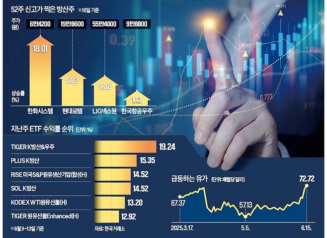 주가 랠리에 불을 붙인 건 우크라이나·러시아 전쟁에 이은 이스라엘·이란 분쟁이다. 지난주에도 상장지수펀드(ETF) 수익률 상위권을 방산 관련 상품이 휩쓴 것으로 집계됐다. ‘TIGER K방산&우주’와 ‘PLUS K방산’이 1주일 동안 각각 19.24%, 15.35% 오르며 수익률 1, 2위를 차지했다. ‘SOL K방산’(14.52%)은 4위였다.