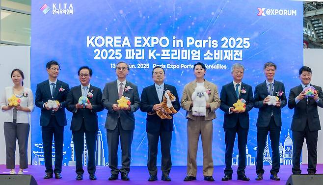 한국무역협회(회장 윤진식)는 지난 13∼15일 프랑스 파리 포르트 드 베르사유(Porte de Versailles) 전시장에서 ‘2025 파리 케이(K)-프리미엄 소비재전’을 열었다. 13일 개막식에서 남상희(왼쪽부터) 한국농수산식품유통공사 파리지사장, 신현대 엑스포럼 대표, 노희열 오로라월드 회장, 문승현 주프랑스한국대사, 구자열 한국무역협회 명예회장, 김동욱 배우, 이인호 한국무역협회 부회장, 이일열 주프랑스한국문화원장, 이규민 한식진흥원 이사장이 기념촬영하고 있다.