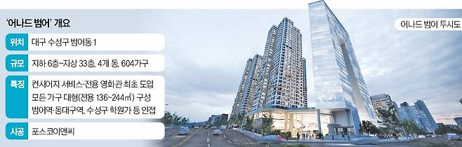 대구 최초의 호텔식 컨시어지 서비스와 입주민 전용 영화관, 최상층 스카이라운지, 프리미엄 마감재. 대구의 대표 부촌으로 통하는 수성구 범어동에서 서울 강남권 아파트에서 볼 법한 서비스와 시설을 갖춘 '하이엔드(최고급) 단지'가 이달 나온다.