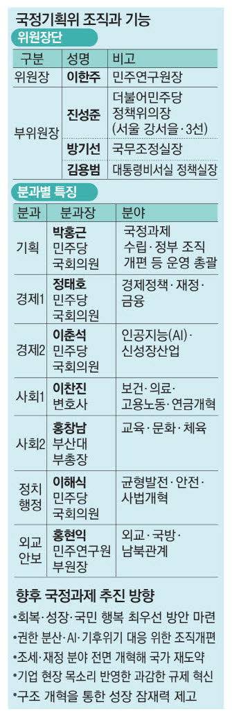 이날 발표된 기획위원 55명 명단에는 현역 민주당 의원이 대거 포함됐다. 기획위원 중 현역 의원만 22명에 달했다. 기획분과에는 분과장인 박홍근 의원을 비롯해 허영(정책), 안도걸(예산) 의원 등이 들어갔다. 특히 대선에서 이 대통령을 지지했던 허은아 전 개혁신당 대표(기획분과)와 최연숙 전 국민의힘 의원(사회1분과) 등 보수 진영 출신 인사도 국정위에 참여해 눈길을 끌었다.