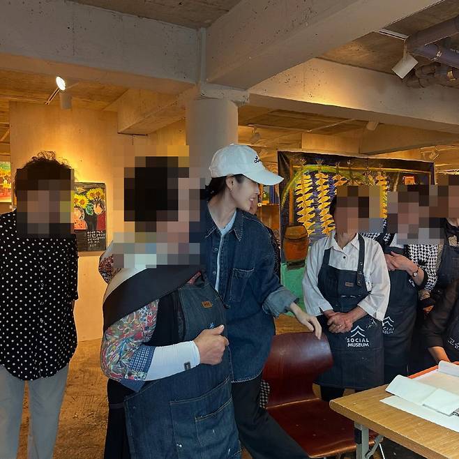 아이유는 화이트 볼캡과 데님 재킷을 매치해 편안한 복장으로 전시회를 감상하고 9명의 할머니 작가들과 포즈를 취하고 있다.