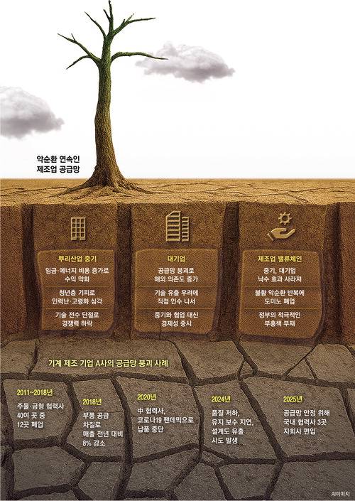 기계 제조 대기업 A사는 주물·금형을 비롯한 뿌리산업 협력사로부터 유압바이스, 축 가공기, 실린더, 전원 장치 같은 부품을 납품받고 있는데 2011~2018년 주요 협력사 40여 곳 중 12곳이 인력난과 원자재값 급등에 따른 수익성 악화로 문을 닫았다. 급작스러운 부품 공급 차질에 A사는 2018년 매출이 전년 대비 8%나 감소했다.