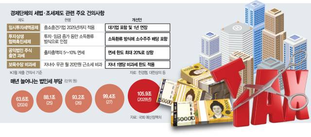 관세 위기를 기회로 바꾸기 위한 대기업의 과감한 국내 설비투자에는 파격적인 세제 혜택을 달라는 내용도 검토하고 있다. 지난해 말 여야는 임시투자세액공제를 연장하면서 대기업만 제외한 바 있다. 이 제도는 올해 일몰 시기가 재도래하는데 이 대통령의 ‘인공지능(AI) 100조 원 투자 시대’를 열려면 중소·중견기업에 대한 임시투자세액공제 추가 연장은 물론 대기업에도 확대 적용이 필요하다는 게 재계의 입장이다.