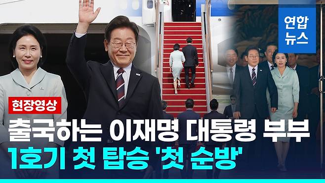 이 대통령은 파란색과 빨간색, 흰색이 섞인 줄무늬 넥타이 차림으로, 김 여사는 연녹색 정장을 입고 1호기에 탑승했습니다.