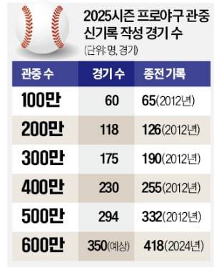 올 시즌 프로야구는 사상 최초 1000만 관중 시대를 연 지난 시즌을 훌쩍 뛰어넘는 흥행을 이어가고 있다. 역대 최소 경기 100만 관중(60경기) 돌파를 시작으로 200만 관중(118경기), 300만 관중(175경기), 400만 관중(230경기), 500만 관중(294경기) 모두 최단기간 신기록을 달성했다.