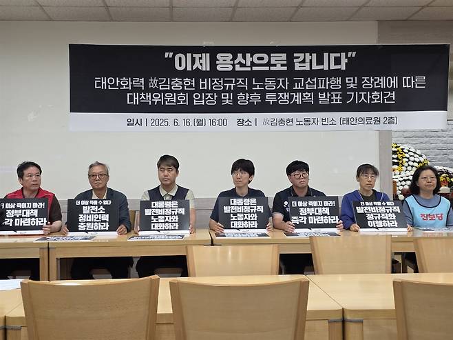 태안화력 고 김충현 비정규직 노동자 사망사고 대책위원회(아래 대책위)는 16일 오후 4시 30분 고인의 빈소인 태안보건의료원 상례원에서 긴급 기자회견을 열어 "이제 용산으로 갑니다"라며 용산 대통령실 앞 무기한 농성 돌입을 선언했다.