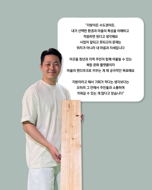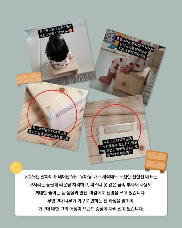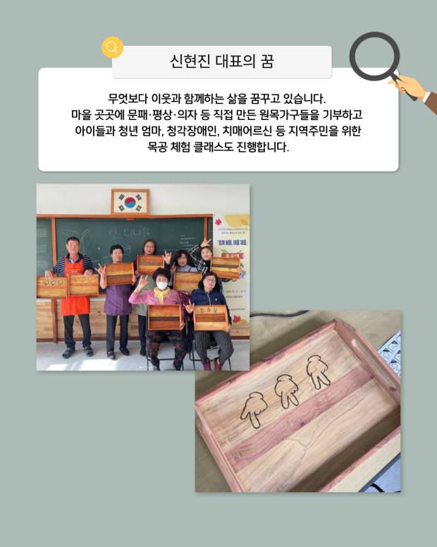 신 대표는 무엇보다 이웃과 함께하는 삶을 꿈꾸고 있으며, 마을 곳곳에 문패·평상·의자 등 직접 만든 원목가구들을 기부하고 아이들과 청년 엄마, 청각장애인, 치매어르신 등 지역주민을 위한 목공 체험 클래스도 진행하며 지역사회에 선한 영향력을 넓혀가고 있습니다.