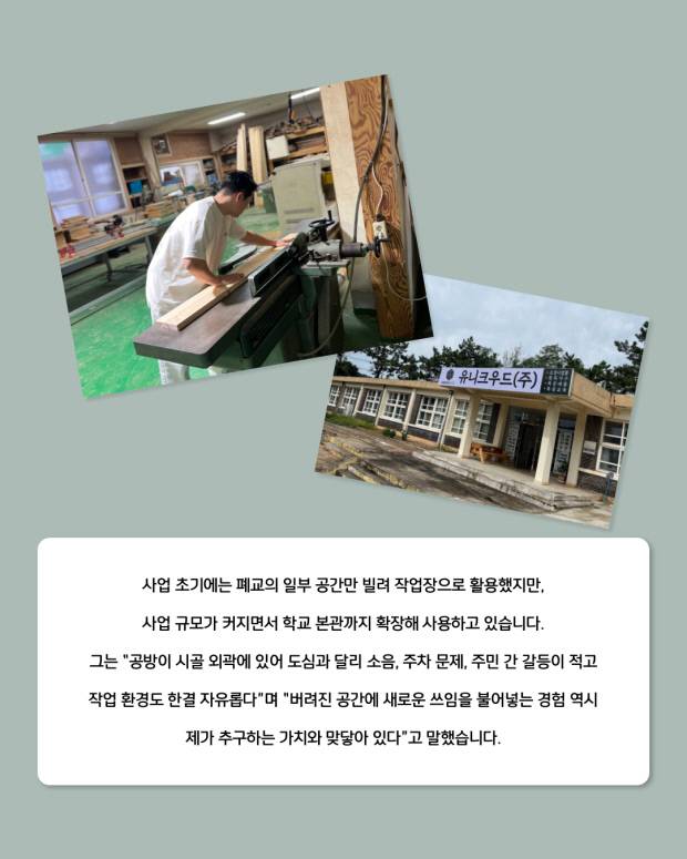 무안 청계면의 한 폐교에는 자연 그대로의 특수목을 활용해 원목가구를 만드는 목공방 '유니크우드㈜'가 있습니다.
