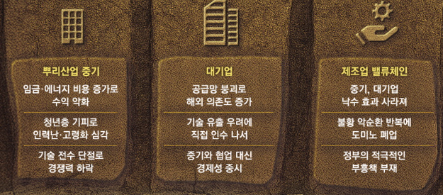 A사가 제품을 만들려면 주물·금형·도금 같은 뿌리산업 공급망이 필수인데, 이미 10여 년 전부터 낮은 임금과 청년층 유입 부족으로 '밸류체인'이 붕괴되고 있다는 지적이다.