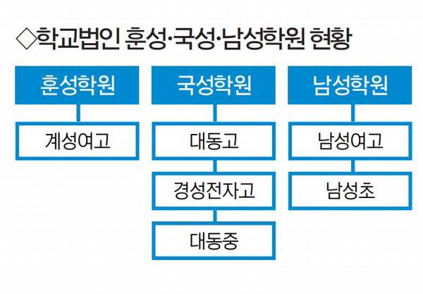 부산에서 가장 많은 사립학교를 운영하는 학교법인 훈성·국성·남성학원의 전·현 이사장이 재단 운영권을 둘러싼 갈등을 벌여 내홍을 겪는다. 공익이 담보돼야 할 교육계에 사학 운영권 다툼이 벌어지면서 학생 수업권에 악영향을 미칠 수 있다는 우려가 나온다.