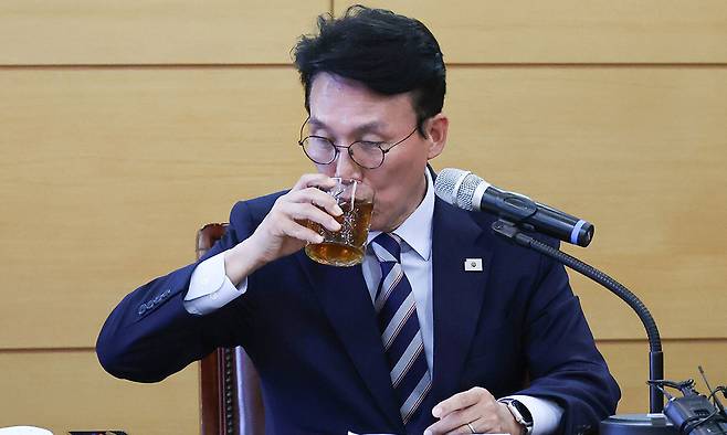 | 물 마시는 총리 후보자 김민석 국무총리 후보자가 16일 서울 종로구 금융감독원 연수원에 마련된 인사청문회 준비단 사무실에서 경제·민생 분야 부처 업무보고를 받던 중 물을 마시고 있다. 뉴스1 |