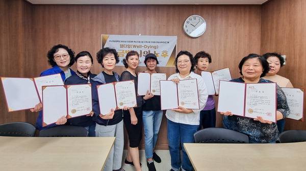 최근 운영된 '황금빛 나의 오후' 프로그램은 신평사랑채노인복지관(대표 윤현주)과 협력해 65세 이상 노인을 대상으로 한 웰다잉(Well-dying) 교육 과정으로, 지난달 15일부터 매주 목요일 총 4회 진행됐으며 지난 5일 수료식(사진)을 가졌다.