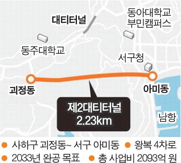 16일 부산시의회에 따르면 부산시가 제출한 2025년도 2회 추가경정 예산안에 편성된 ‘제2대티터널 기본 및 실시설계 사업비’(14억1000만 원)가 해양도시위의 심사에서 9억 원이나 줄어든 5억1000만 원으로 조정돼 예산결산특별위원회에 제출됐다. 제2대티터널은 괴정동 사하로와 아미동 부산대병원 인근 까치고개로 사이 왕복 4차로(2.23㎞)로 추진된다. 시는 총사업비 2039억 원을 들여 2033년 완공을 목표로 한다. 2017년 국토교통부 대도시권 교통혼잡도로로 지정된 이후 2022년부터 기획재정부 한국개발연구원(KDI) 예비타당성조사에 들어갔다. 박형준 시장과 국민의힘 이성권(사하갑) 의원은 물론 더불어민주당 최인호 사하갑 지역위원장도 현역 때 예타 통과를 위해 사활을 걸었던 사업이다. 그렇게 지난해 10월 이 사업은 예타를 통과했고, 시와 지역사회는 서부산권의 만성적 교통난을 해소할 것으로 크게 기대했다. 시는 예타 통과 후 기본 및 실시설계 용역을 위해 이번 추경예산안에 관련 예산을 반영했다.