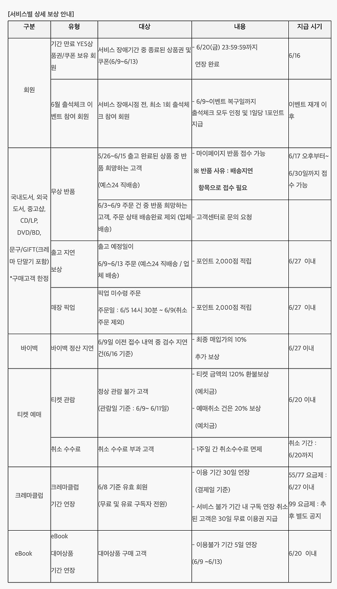 해당 기간에 도서, 음반, 문구 등 출고 지연 피해자에게는 포인트 2,000점을 제공한다. 티켓 예매를 했으나 공연을 못 본 고객에겐 티켓 금액의 120%를 환불한다.