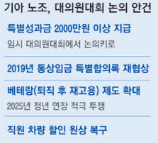 기아 노조는 임단협 요구안의 방향성 등을 결정하는 정기대의원대회를 통해 특별성과급 2000만원 이상, 직원 차량 할인 제도 원상 복구 등의 방안을 논의한 것으로 파악됐다.