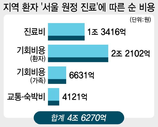 보고서에 따르면 지역 환자가 서울 상급종합병원에 가서 진료를 받음으로 인해 발생하는 연간 순 비용은 교통·숙박비만 고려했을 때 4121억 원으로 추산됐다. 서울과 지역 간 진료비 차이를 반영하면 1조 7537억 원으로 늘고, 업무 복귀 등 환자와 가족의 기회비용을 고려하면 4조 6270억 원으로 폭증한다. 순 비용은 ‘유출 환자’가 서울 상급종합병원에서 진료를 받을 때 발생하는 총비용에서, 환자의 거주지역에서 진료를 받을 때 발생할 총비용을 뺀 값이다.