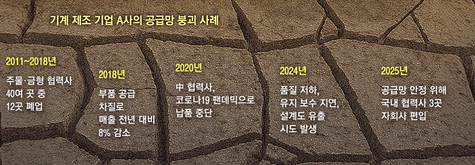 A사는 대신 중국 업체들과 공급 계약을 맺고 반전을 노렸지만 여의치 않았다. 코로나19 팬데믹으로 일시 중단됐던 납품이 재개됐지만 품질 저하를 피할 수 없었다. A사 대표는 “수십 년 동안 회사에 맞게 공정을 구축해왔던 국내 협력사들과 비교할 때 중국 업체들의 품질은 만족스럽지 못했고, 유지 보수에 있어서도 문제가 자주 발생했다”고 꼬집었다. 결국 생산 피해액이 3년간 1200억원이나 발생했고, 회사 창립 이후 최악의 실적으로 이어졌다.