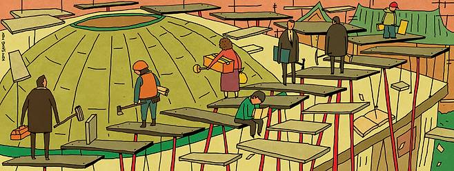 87년 체제의 가장 큰 문제점은 누구의 의도와 주도로 이루어졌든 간에 인식 정향의 측면에서 나타나는 ‘세 가지 삭제’이다. 이 지면의 다른 글(“정의당 0석에 대한 ‘우려 섞인 관심’의 이유”·2024년 5월14일자)에서도 언급한 바 있다. 계급, 역사, 유토피아 모멘트 인식의 삭제다. 사회적 약자의 존재 혹은 자신을 비롯한 다수의 약자 됨에 대한 인식 가능성을 차단하고, 고통을 강요하는 현실을 타파하기 위한 연대와 저항의 경험과 기억 그리고 이를 살려 변혁을 도모할 가능성을 봉쇄함으로써 지금과 다른 더 나은 세상을 꿈꿀 상상력마저 지워버렸다는 의미다. 이런 체제에서는 약자를 억압하거나 무시할 뿐만 아니라, 독재 혹은 권위주의 체제로의 회귀를 꿈꾸는 낡은 세력의 횡행을 막을 수 없다. 그런 존재의 부당함을 따져 물을 사회의 의지와 힘이 미약하기 때문이다. ‘영끌을 통한 나의 생존’이라는 험난한 삶의 도정에서 얻은 피로감과 우울함만이 남아 있을 따름이다.